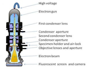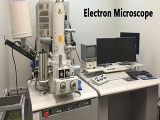 The document discusses electron microscopes. It defines electron microscopes as microscopes that use accelerated electrons rather than light to illuminate samples. Ernst Ruska built the first electron microscope in 1931. The document describes the working principles of transmission electron microscopes and scanning electron microscopes, including how each forms images. It also outlines the key components and parts of electron microscopes, their applications, advantages, and limitations.