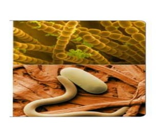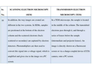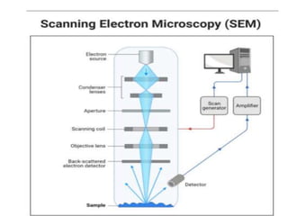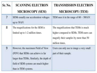 The document summarizes electron microscopes. It describes that Ernst Ruska invented the first electron microscope in 1931, which uses a beam of electrons instead of light to magnify objects. It has three main parts - an electron gun that generates electrons, electromagnetic lenses that focus the electron beam, and a specimen holder. Electron microscopes can magnify objects up to two million times, allowing visualization of structures at the nanoscale. There are two main types - transmission electron microscopes (TEM), which produce highly detailed images but require thin specimens, and scanning electron microscopes (SEM) which scan surfaces and provide 3D topographic information.
