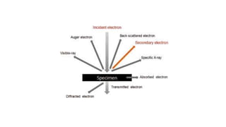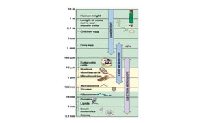 The document discusses the principles and history of electron microscopy, highlighting its advantages over light microscopy, including higher magnifications and resolving power. It describes the components and working mechanisms of two types of electron microscopes: transmission electron microscopes (TEM) and scanning electron microscopes (SEM). Additionally, it notes the applications and efficiency of SEM, emphasizing the ability to obtain detailed 3D images with minimal sample preparation.