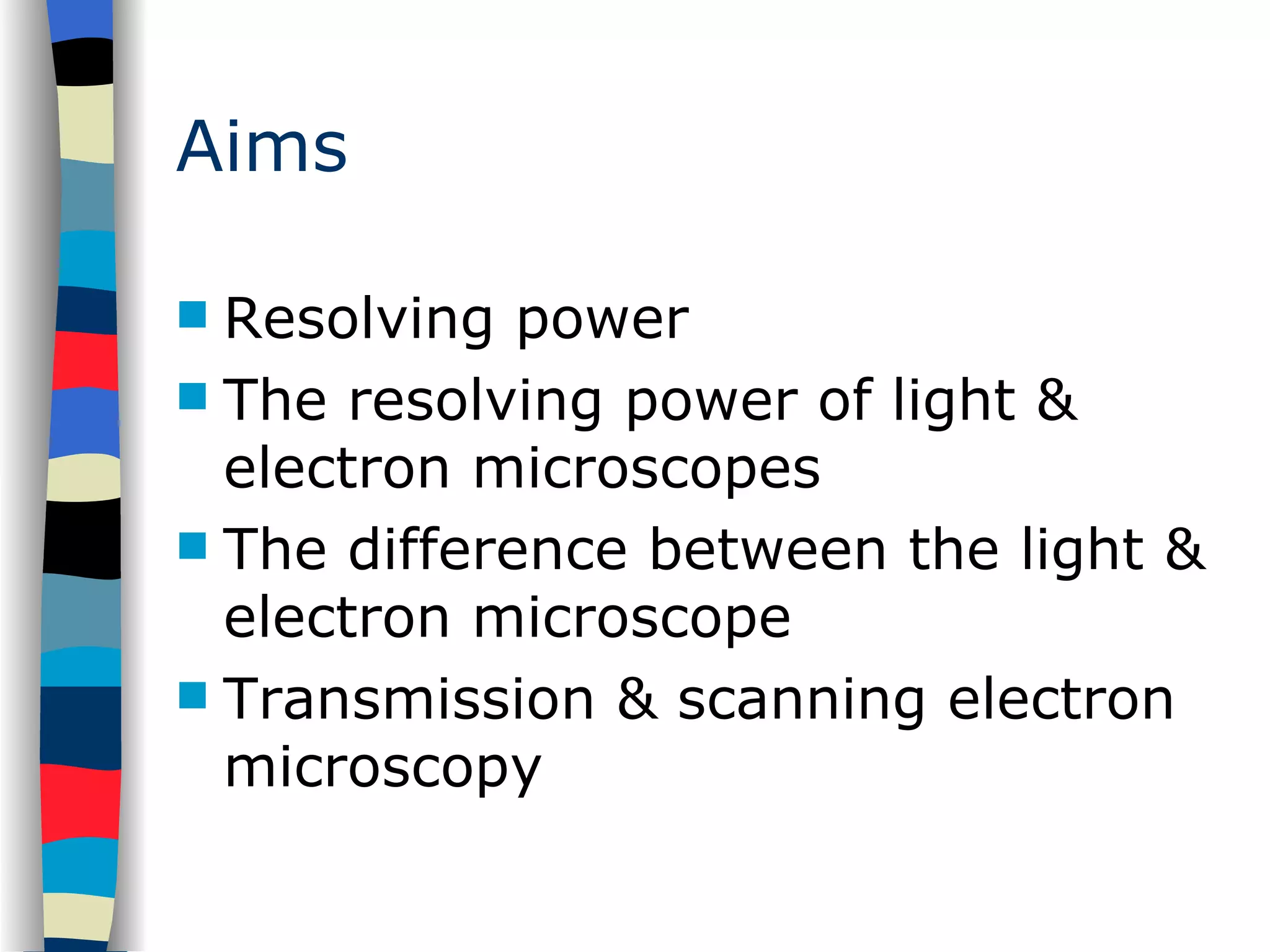 Aims Resolving powerThe resolving power of light & electron microscopes The difference between the light & electron microscope Transmission & scanning electron microscopy