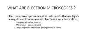 Electron microscopes (EMs) are advanced scientific instruments that utilize energetic electrons to examine fine details of objects, achieving magnification between 100 to 250,000 times that of light microscopes. There are two primary types of EMs: Transmission Electron Microscopes (TEM), which focus on the inner structure of specimens, and Scanning Electron Microscopes (SEM), which visualize surfaces, each offering unique applications and advantages in the study of cellular and structural features. TEM enables molecular-level insights into cells and viruses, while SEM provides detailed 3D images of surfaces for various microscopic specimens.