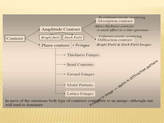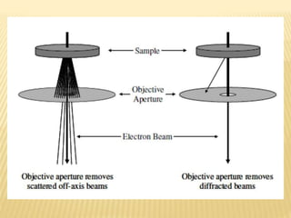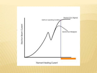 The document discusses electron microscopes and their components and operation. Electron microscopes use a beam of electrons instead of light to examine objects at a very fine scale. There are two main types - scanning electron microscopes (SEM) and transmission electron microscopes (TEM). SEMs produce higher resolution images than optical microscopes and work by scanning a focused beam of electrons across a sample. TEMs require electron-transparent samples and work by transmitting electrons through a sample to form an image. Both types of electron microscopes have advanced scientific understanding by allowing observation of microscopic structures.