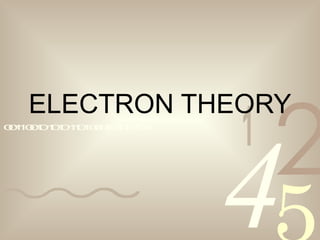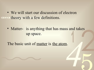 The document discusses electron theory and static electricity. It defines key terms like matter, energy, atoms, ions, conductors, and insulators. It explains that atoms are made up of protons, neutrons, and electrons, and that static electricity occurs when electrons are transferred between materials that are rubbed together, resulting in one material gaining a positive charge and the other a negative charge. It also provides examples of static electricity like rubbing a balloon on wool to make it stick to a wall.