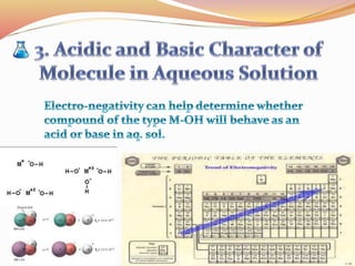 Pauling was the first to propose a scale of electronegativity in 1932 based on the difference in the measured energy of an AB bond and the expected energy of a purely covalent AB bond. Mulliken suggested an approach to electronegativity in 1934 based on ionization enthalpy and electron affinity, defining electronegativity as the arithmetic mean of ionization energy and electron affinity. Electronegativity is influenced by factors such as charge on the atom, hybridization state, ionization energy, electron affinity, and effective nuclear charge. It is used to determine bond polarity, percent ionic character, and enthalpy of formation.