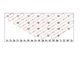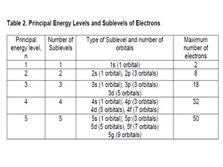 3) The aufbau principle and Pauli exclusion principle govern how electrons fill atomic orbitals based on energy and allowing no more than two electrons of opposite spin per orbital. Hund's rule favors occupying each orbital in a sublevel singly before pairing electrons.
