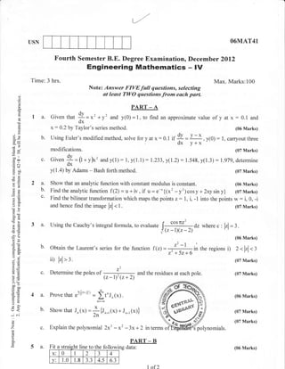 Part A of Engineering Mathematics asks students to: 1) Find an approximate value of y at x=0.1 and 0.2 using Taylor's series, 2) Solve a differential equation using Euler's modified method and carry out three modifications, 3) Determine the value of y(1.4) using Adams-Bashforth method given values of y at other points.
