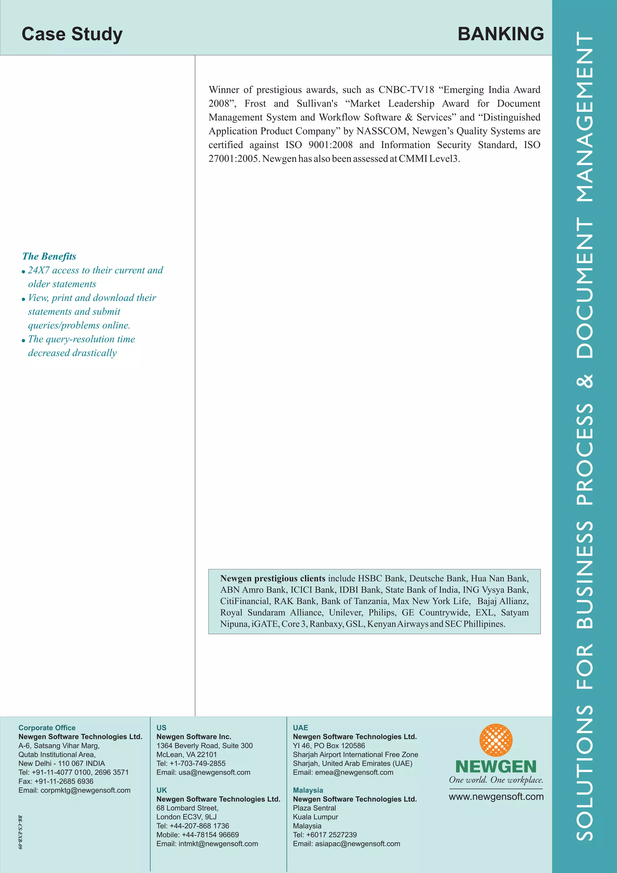 The document discusses an electronic bill presentment solution implemented by Newgen for a leading Tanzanian bank. The bank wanted to lower costs and improve the delivery of statements to customers. Newgen implemented a solution that allows customers online access to current and past statements. This reduced query times and cut printing/mailing costs. The bank has seen improved customer satisfaction since implementing Newgen's solution.