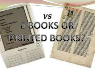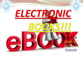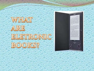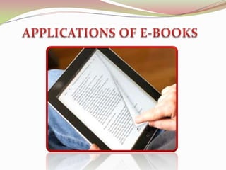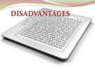 The document defines an electronic book as a book-length digital publication that can be read on computers or electronic devices. It notes that e-books can be used by people of all ages and backgrounds, and that electronic copies of educational and fiction books are popular. Some advantages of e-books are that they save trees, can hold multiple books, are portable, and don't take up physical space. However, e-books also have disadvantages like technological issues, eye strain, limited selection, and fragility.