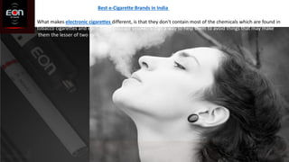 The document discusses electronic cigarettes (e-cigs) as a potentially safer alternative to traditional cigarettes, highlighting the debate between proponents and medical professionals regarding their safety. It details that e-cigs contain fewer harmful chemicals than combustible cigarettes and are marketed as tools for smoking cessation, although no e-cigarette has been approved by the FDA for this purpose. The document also mentions the abundance of brands available in India for those considering e-cigs.