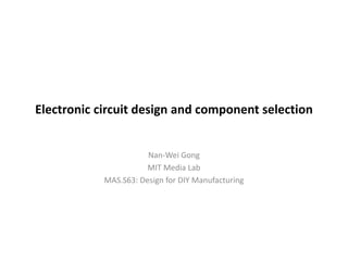 This document provides an overview of the electronic circuit design and component selection process. It discusses testing circuits, selecting components, PCB design, manufacturing, and assembly. Key steps include testing circuits using breadboards or simulations, choosing components based on specifications, laying out PCB traces with consideration for power/ground planes and signal routing, and assembling boards using soldering or pick-and-place machines. Tips are provided for design rules, decoupling, and ordering PCB fabrication and assembly services.