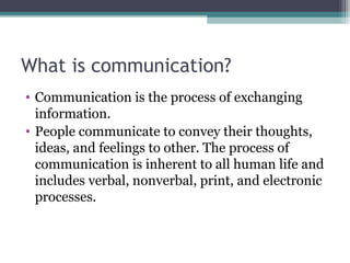 This document discusses electronic communication and its advantages. It defines electronic communication as consisting of a transmitter, communication channel, and receiver that converts messages to electrical signals sent over cables or wireless networks. Some key advantages discussed are speed, wide coverage enabling global communication instantly, and lower costs compared to traditional methods. Electronic communication allows for instant feedback exchange and helps managers control global operations remotely. Examples of electronic communication types covered are email, podcasting, discussion boards, blogs, text messaging, and chatting.