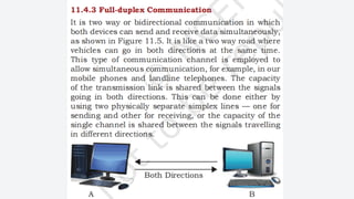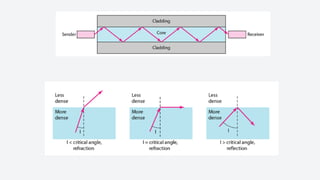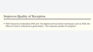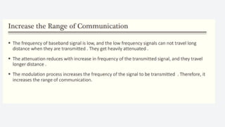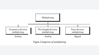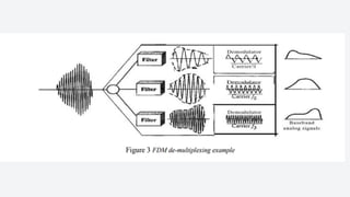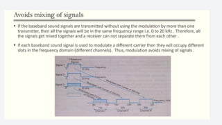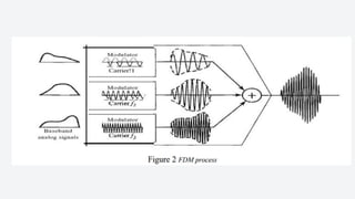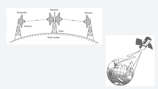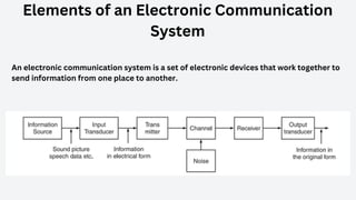 An electronic communication system consists of devices that transmit information from a source to a receiver, utilizing components like transducers, transmitters, and channels. Guided media includes cables and fiber optics, while unguided media uses wireless transmission methods. Modulation and multiplexing are crucial processes that allow signals to be adjusted for transmission and for multiple signals to be sent over the same channel simultaneously.