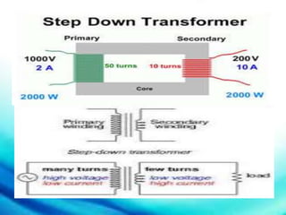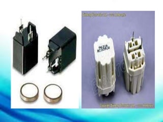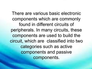 This document discusses various electronic components that are commonly found in electronic circuits. It describes active components like transistors that supply and control energy, and passive components like resistors and capacitors that either dissipate or store energy in response to electric currents. It then provides details on important electronic parts such as resistors, capacitors, inductors, diodes, transistors, fuses, switches, transformers, integrated circuits, relays, thermistors, photocouplers, thyristors, and flyback transformers. It explains their basic functions and how to test some of these components.