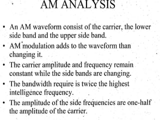 This document discusses various electronic communication systems including amplitude modulation (AM) and frequency modulation (FM) transmitters and receivers. It provides block diagrams and circuit implementations of basic AM transmitters using a transistor modulator. It also covers AM receivers using diode and synchronous detectors. For FM it discusses varactor diode modulation, direct and phase locked loop transmitters as well as FM receiver designs using slope detection. Circuit simulations and output waveforms are presented for several of the communication system examples.