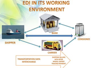 This document discusses Electronic Data Interchange (EDI), including what it is, how it works, its components, advantages over paper-based systems, and cost benefits. EDI involves the electronic transfer of structured business documents between organizations using a standard format. It eliminates paper-based processes by providing an electronic link between trading partners. Key advantages of EDI include reduced data entry and improved business cycle times, as well as lower costs from things like fewer errors and expedited transactions. EDI systems typically involve three main components: business applications, translation services, and communication services to transfer data between partners.