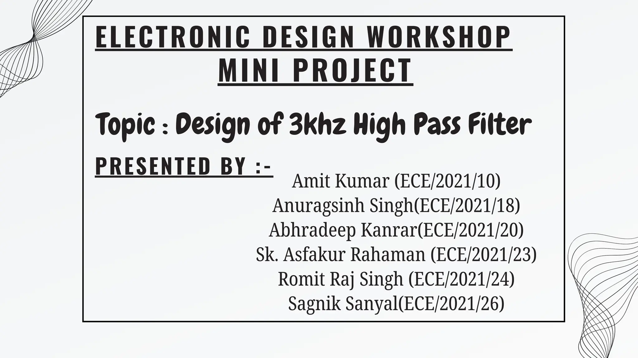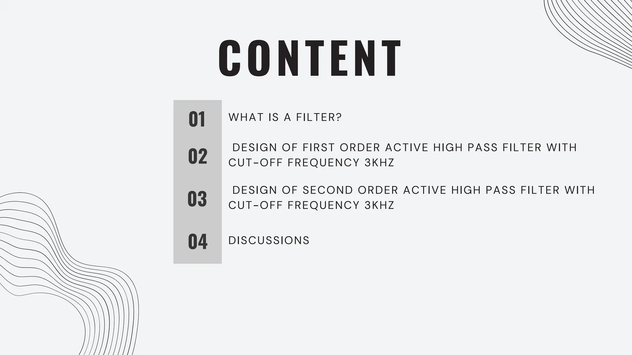 This document outlines the design of 3kHz high-pass filters, including both first-order and second-order active filters. It discusses the principles of filtering, provides formulas and calculations for the filter designs, and highlights their respective performance characteristics. The first-order filter is simple and cost-effective, while the second-order filter offers enhanced performance with a steeper roll-off for better rejection of low-frequency signals.