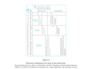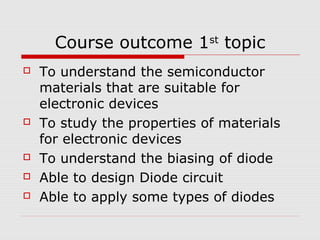 This document provides information about the EEE132 Electronic Devices course, including the course outcomes, assessments, textbooks, and topics to be covered. The topics include semiconductor materials, properties of materials for electronic devices, biasing of diodes, designing diode circuits, and different types of diodes. It discusses semiconductors like silicon, germanium, gallium arsenide and their atomic structures. It also covers intrinsic and extrinsic semiconductors, doping using elements like phosphorus and boron to create n-type and p-type materials, and how this affects the fermi level and carrier concentration in the semiconductor.