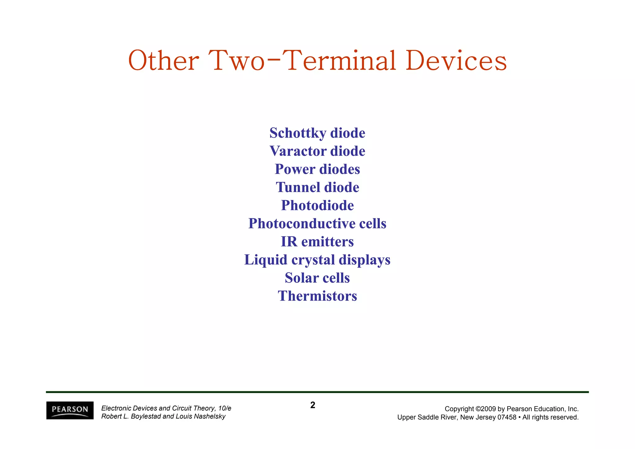 This chapter discusses various two-terminal devices including Schottky diodes, varactor diodes, power diodes, tunnel diodes, photodiodes, photoconductive cells, IR emitters, liquid crystal displays, solar cells, and thermistors. It provides brief descriptions of each device and their operating principles as well as common applications.