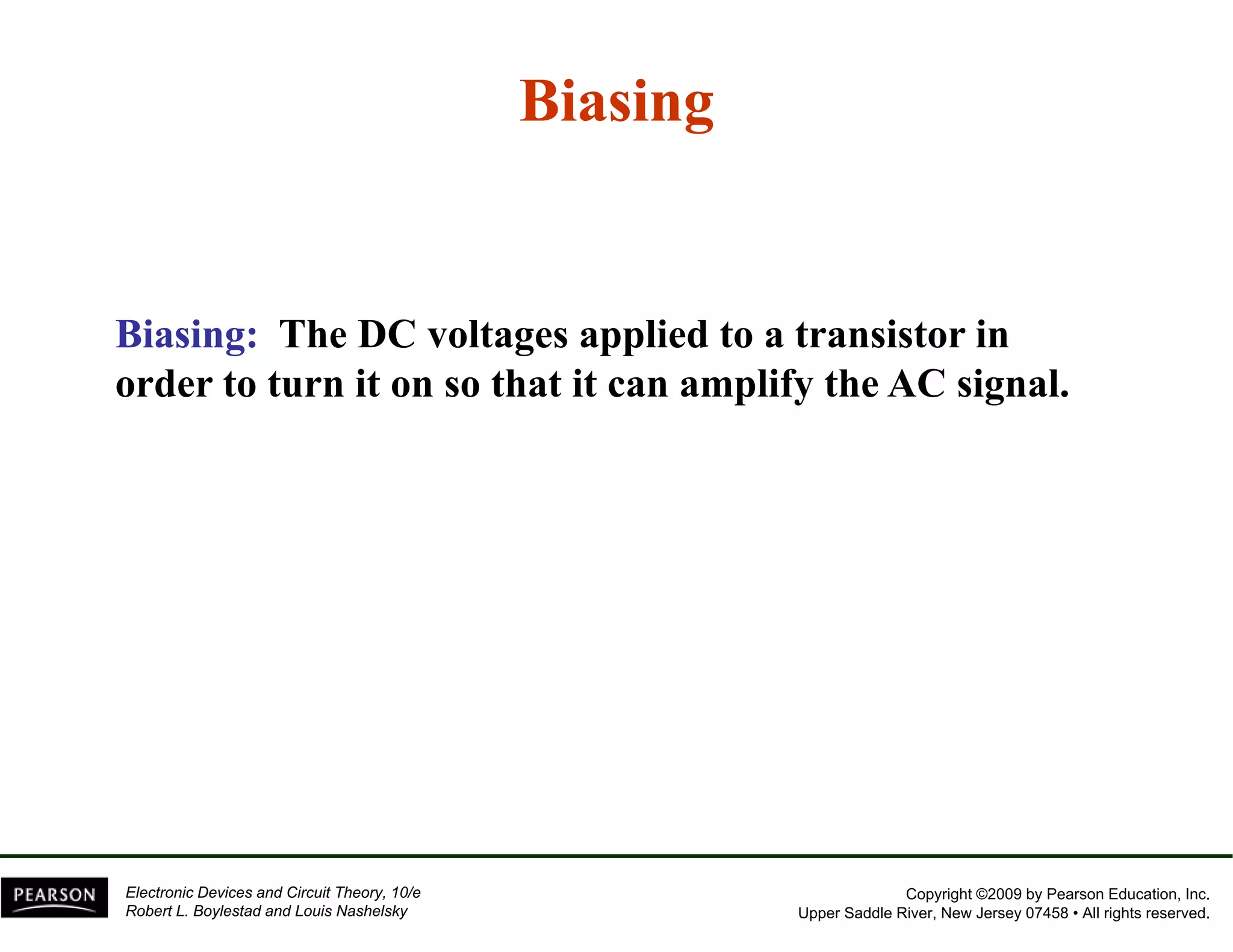 This document discusses different methods of biasing BJT transistors, including fixed bias, emitter-stabilized bias, and voltage divider bias circuits. It explains how the DC bias voltages establish an operating point (Q-point) for the transistor in either the active, cutoff, or saturation regions. Load line analysis is used to determine the transistor's Q-point based on the bias circuit components and supply voltage. Feedback circuits are also introduced to improve stability against variations in the transistor's beta value.