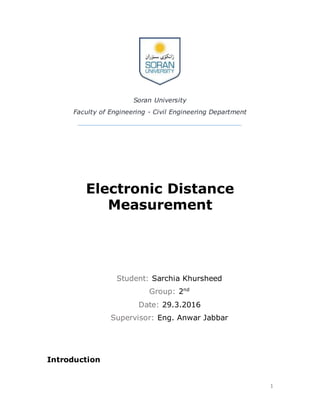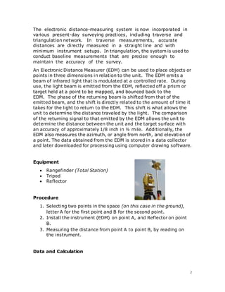 1. The document discusses electronic distance measurement (EDM) using a total station to measure distances between two points. An EDM emits a beam of light to a target prism and back to calculate the distance based on the phase shift of the returning beam.