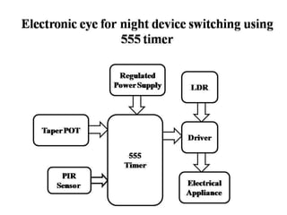 The document describes the development of an intelligent system that utilizes sensors and a 555 timer to control electrical appliances based on human presence and time of day. It outlines the main components, including PIR and LDR sensors, along with the advantages and potential applications of the system for energy conservation. The project successfully integrates various hardware features to enable automatic switching, significantly reducing power waste.