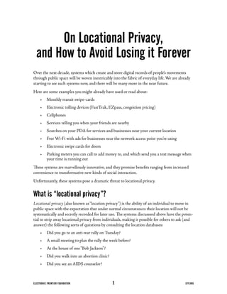This document discusses the threat to locational privacy posed by new technologies that track people's locations. It provides examples of existing technologies like transit cards and toll payment systems that create digital records of people's movements. While these technologies provide benefits, they threaten privacy by allowing others to easily access records of people's locations and activities. The document argues that systems should be designed from the start with privacy in mind using cryptography to provide location services without actually collecting location data. It provides examples of how this could work for toll payments and traffic enforcement using techniques like electronic cash and dynamic license plates.