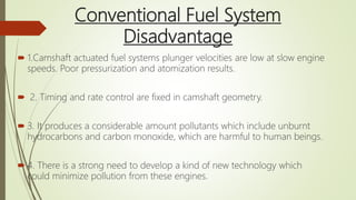 This document discusses electronic fuel injection systems and their advantages over conventional fuel systems. It notes that conventional systems have issues with fuel pressurization and atomization at low engine speeds as well as fixed timing and fuel rates. Electronic fuel injection systems address these issues by allowing variable timing and duration of fuel injection. Direct fuel injection systems in particular have been shown to significantly reduce unburned hydrocarbon emissions by carefully timing fuel injection to prevent unburned fuel from escaping during exhaust. The timing and duration of fuel injection is electronically controlled for optimal emissions, fuel efficiency, and noise reduction.