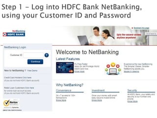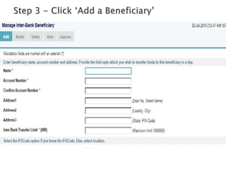 The document outlines various methods for transferring money electronically, including NEFT, RTGS, and IMPS, highlighting the ease of these transactions in India. NEFT, which launched in November 2005, allows transfers through 30,000 bank branches with no minimum or maximum limits. The document provides a step-by-step guide on how to add a beneficiary and complete the fund transfer process securely.