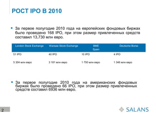 Документ обсуждает путь к IPO для российских компаний, подчеркивая положительные тенденции в 2010 году с 12 первичными размещениями, общим объемом 5,35 млрд долларов США. Описываются крупнейшие фондовые биржи мира и их требования для выхода на IPO, включая Нью-Йоркскую и Лондонскую фондовые биржи. Также рассматриваются основные факторы успеха для компаний, стремящихся выйти на IPO, включая сильную управленческую команду и профессиональную подготовку.