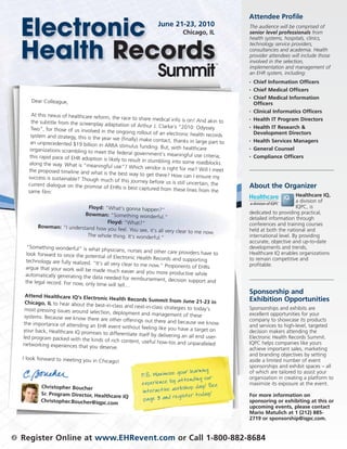 The Electronic Health Records TM Summit, taking place from June 21-23, 2010, in Chicago, IL, aims to help healthcare professionals navigate the challenges of implementing electronic health records amidst healthcare reform. Featuring over 15 innovative speakers and intensive workshops, the event focuses on practical strategies for achieving 'meaningful use' and avoiding common pitfalls in the selection and management of EHR systems. Attendees will benefit from interactive learning, networking opportunities, and expert guidance through the 'EHR brilliance bar' to address their specific concerns.