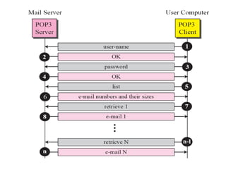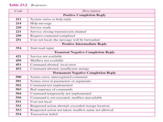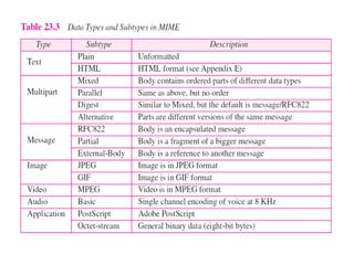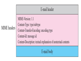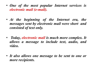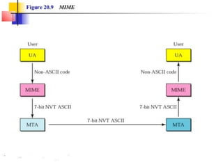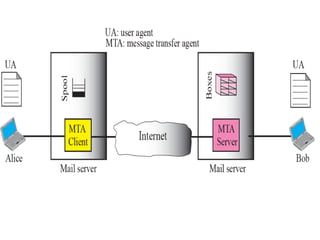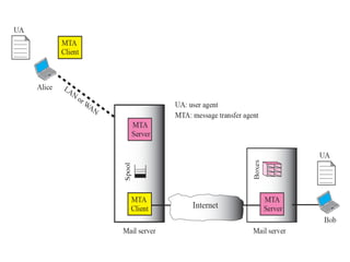 The document discusses the evolution and architecture of electronic mail (e-mail), detailing scenarios for sending and receiving messages across shared systems and the internet. It explains the roles of user agents, message transfer agents (MTAs), and message access agents (MAAs) in handling e-mail, including protocols like SMTP, POP3, and IMAP4. Additionally, it describes MIME for non-ASCII data and various functionalities of user agents, such as composing, reading, and replying to messages.