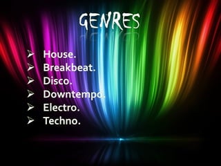 Electronic music uses electronic instruments and technology in its production. It emerged in the late 1960s and includes genres like electro, techno, and downtempo. Major electronic music festivals are held across the United States annually, especially in cities like San Diego, Philadelphia, Dallas, San Francisco, and Miami.
