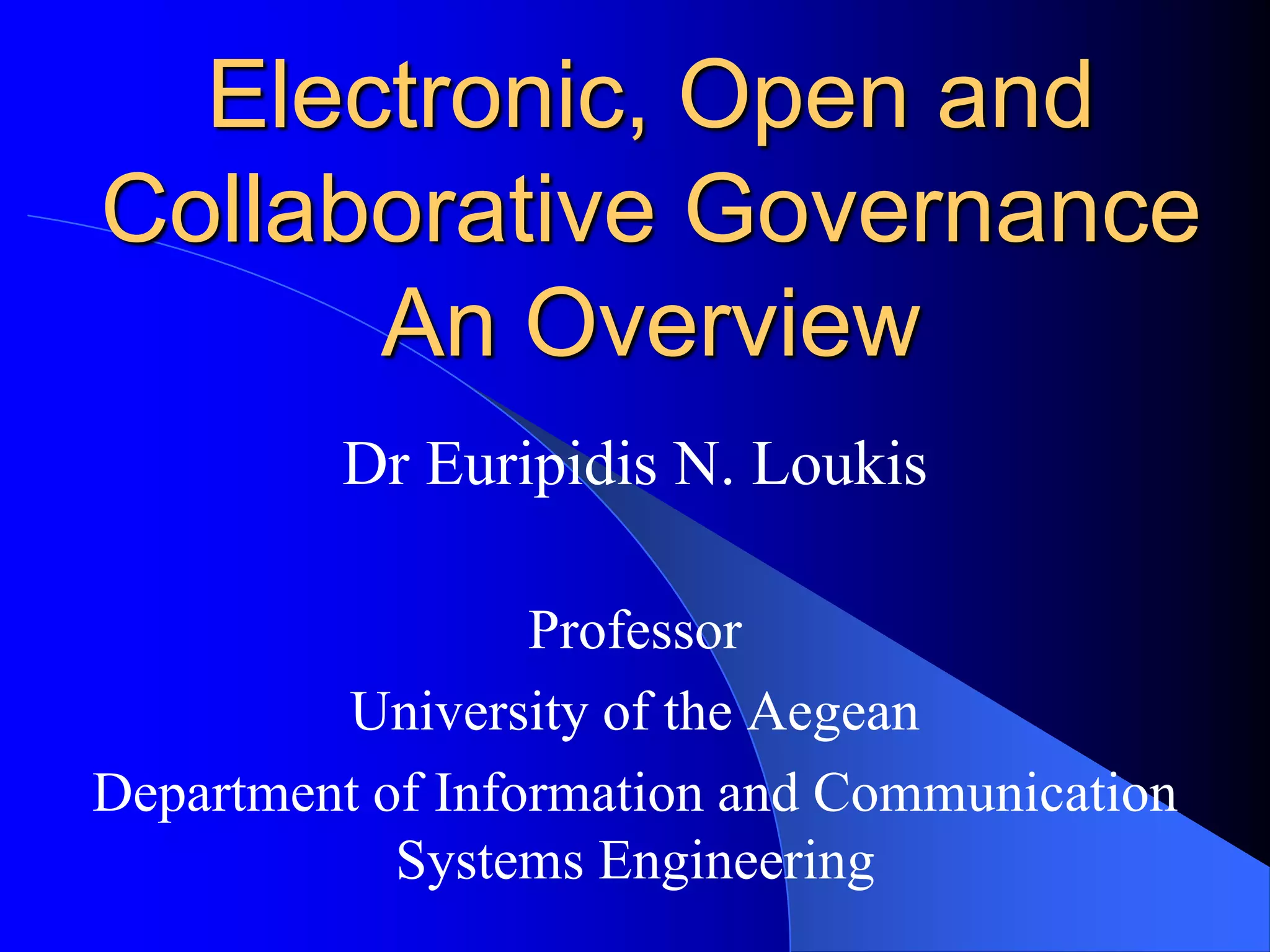 The document provides an overview of electronic, open, and collaborative governance, emphasizing the evolution of e-government systems and their role in enhancing government efficiency and public services. It discusses the importance of integrating traditional and innovative information systems for better service delivery, stakeholder engagement, and policy-making. Additionally, it outlines the challenges and opportunities related to ICT adoption within government agencies, including the transition from basic automation to transformative governance models.