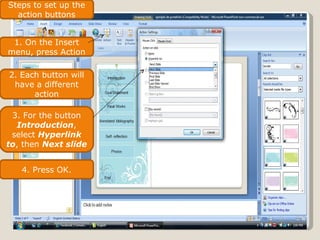 The document provides instructions for setting up action buttons on a presentation slide. It describes setting hyperlinks from buttons to navigate to different slides within the presentation for an introduction, goal statement, works, annotated bibliography, self-reflection, and photos. It offers two options for linking to external work documents, either copying the text to slides or linking directly to files saved on a CD.