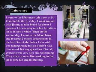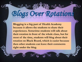 The document summarizes a student's experience in a health academy program, including rotations in various medical settings like the laboratory, surgery, pediatrics, and the ER. It discusses the goals of exposing students to healthcare careers and how the program helped prepare students for employment through activities like creating resumes and cover letters. The student explored different career interests such as pharmacy, physician assistant, and radiology through research and lectures. Overall, the student felt the health academy provided valuable knowledge and experiences to inform their future career path.