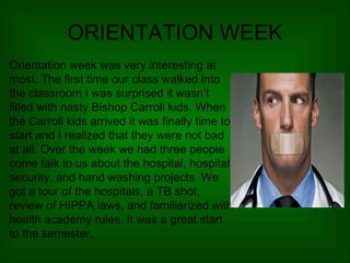 Randy Nguyen reflects on their experience in the St. Gianna Health Academy orientation week. They were surprised to find that the Bishop Carroll students were not bad. Over the week, they received presentations on the hospital, security, and hand washing. They toured the hospital facilities and received medical training.