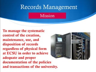 The document discusses records management at ECSU. It aims to systematically control the creation, maintenance, use, and disposition of records regardless of their format. The NC Department of Cultural Resources directs the university's records management program according to state statutes. Electronic records, including email, apps, websites, and social media, must also comply with retention and disposition schedules. The IT department backs up email systems regularly and ensures responsiveness to e-discovery requests.