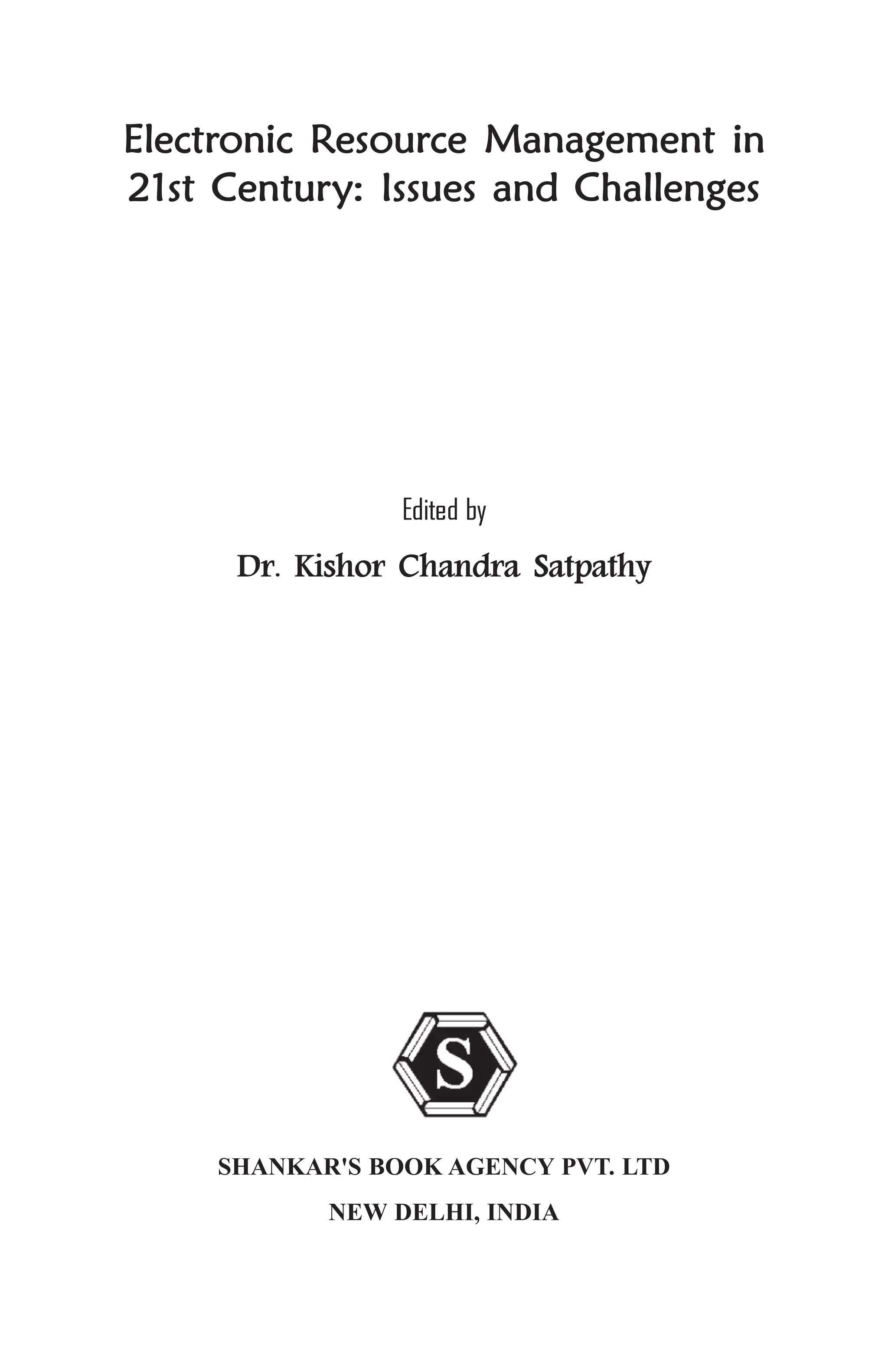 This document provides information about an edited book titled "Electronic Resource Management in 21st Century: Issues and Challenges". The book contains 23 chapters contributed by various authors on topics related to electronic resource management, ICT applications in libraries, and information literacy. It is divided into three sections. The book is edited by Dr. Kishor Chandra Satpathy and published by Shankar's Book Agency Pvt. Ltd. in New Delhi, India. It addresses the issues and challenges of managing electronic resources in libraries and information centers in the digital era.