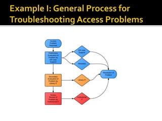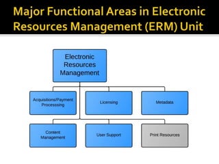 This document discusses the transition of technical services in academic libraries from a focus on print resources to electronic resources. It notes that print usage is declining while electronic usage is increasing, with over half of materials budgets now spent on e-resources. However, technical services departments remain organized for print. The document proposes integrating technical services into a new Electronic Resources Management unit focused on content, user support, licensing, and acquisitions/payment for e-resources. Remaining print staff would join a new Print Resources unit that will phase out over time. It outlines various roles and responsibilities in the new ERM unit and strategies for managing the transition.
