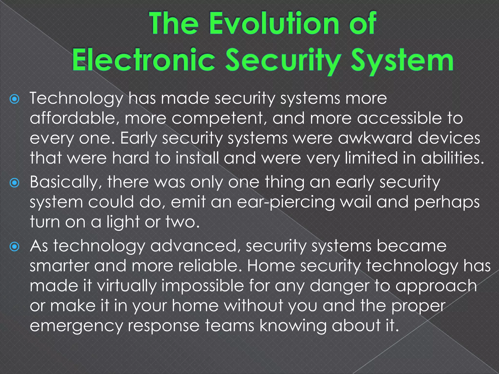 The document discusses the evolution and capabilities of modern security systems. It notes that early security systems were basic and difficult to install, but that technology has made systems smarter, more reliable and put more control in the hands of homeowners. Modern systems can detect intrusions and dangers, alert homeowners and emergency services, and be controlled remotely through internet or cell phone. The document outlines some common electronic security devices like surveillance cameras, fire alarms, intruder alarms, and electronic locks. It provides details on how these systems work and have advanced with technology.