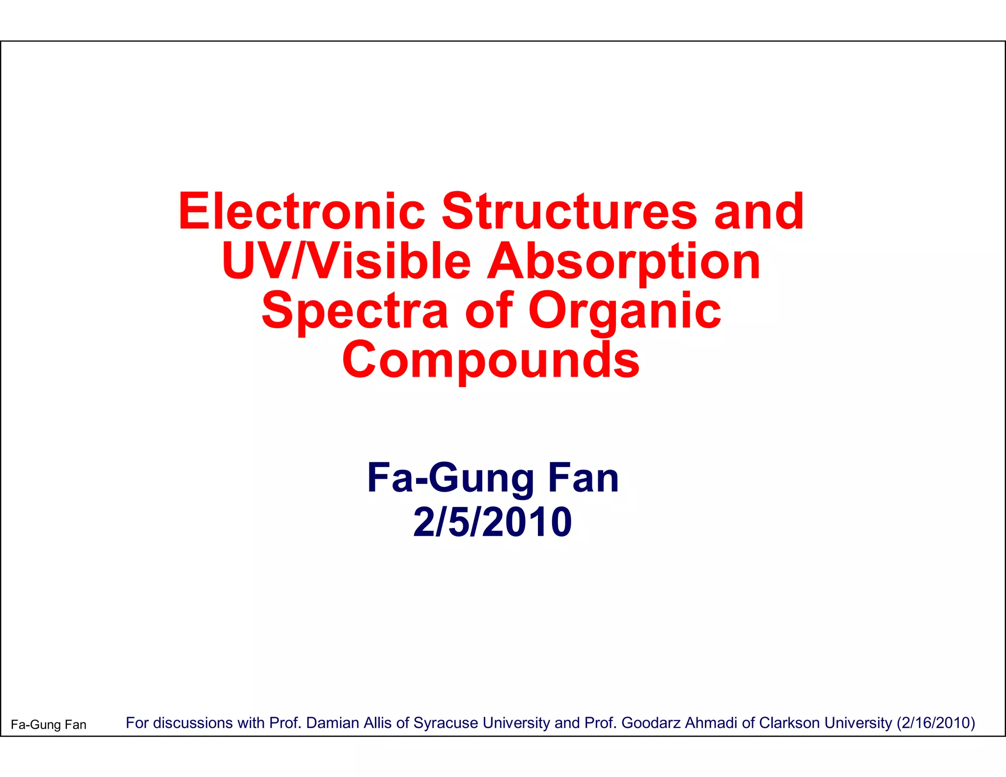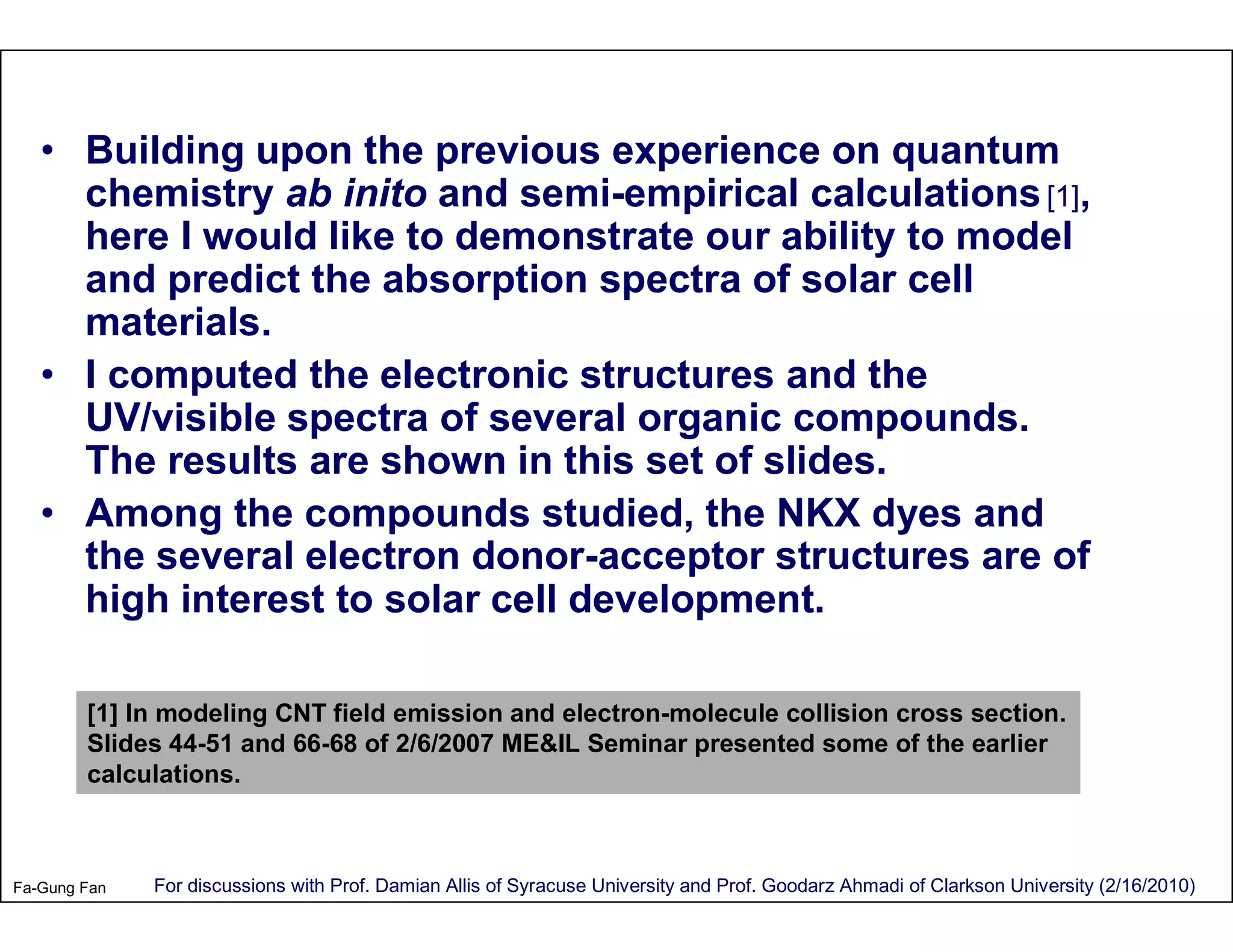 The document describes calculations of the electronic structures and UV/visible absorption spectra of several organic compounds of interest for solar cell applications. The compounds studied include coumarin and NKX dyes, a TPA-BTD donor-acceptor system, and a pentacene-fullerene donor-acceptor system. Ab initio and semi-empirical methods were used to optimize geometries, calculate molecular orbitals and energy gaps, and obtain absorption spectra. The results provide insights into the electronic properties and excited state behaviors of these materials.