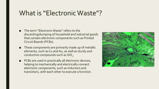 Electronic waste (e-waste) refers to discarded electronic components such as printed circuit boards (PCBs) that contain heavy metals, posing significant health and environmental risks. The global rise in e-waste has led to severe ecological consequences, including heavy metal poisoning in humans and ecosystems, as well as economic inefficiencies due to resource mismanagement. Efforts to combat e-waste through international treaties like the Basel Convention and varying recycling methods are ongoing, although both formal and informal recycling processes have their drawbacks.