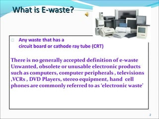 Electronic waste (e-waste) is a growing problem due to factors like the digital television transition. Concerns about e-waste include informal recycling that can release toxic substances, illegal exporting of e-waste especially to Asia, uncontrolled burning and disposal causing environmental and health issues. Various legislations cover different aspects of e-waste management but proposed new rules aim to put in place an effective mechanism making producers responsible for the entire life cycle and environmentally sound disposal of their products. The preferred solutions are reuse through repairing or upgrading equipment, recycle through take-back programs and proper recycling, with disposal in landfills only as a last resort. Individuals can help by raising awareness, promoting recycling opportunities, and encouraging