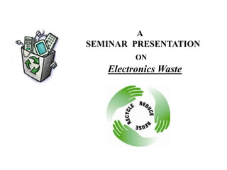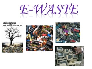 This document discusses electronics waste (e-waste) and its management. It defines e-waste and lists major sources like computers, phones, TVs. India generates 0.8 million tons of e-waste annually, which is growing 10% each year. E-waste contains valuable and toxic materials. The document outlines recycling and disposal methods like reuse, dismantling, and material recovery which can have environmental and economic benefits but are currently not well regulated in India. It calls for more awareness, legislation, and safer recycling practices to better manage the large and growing quantities of e-waste.