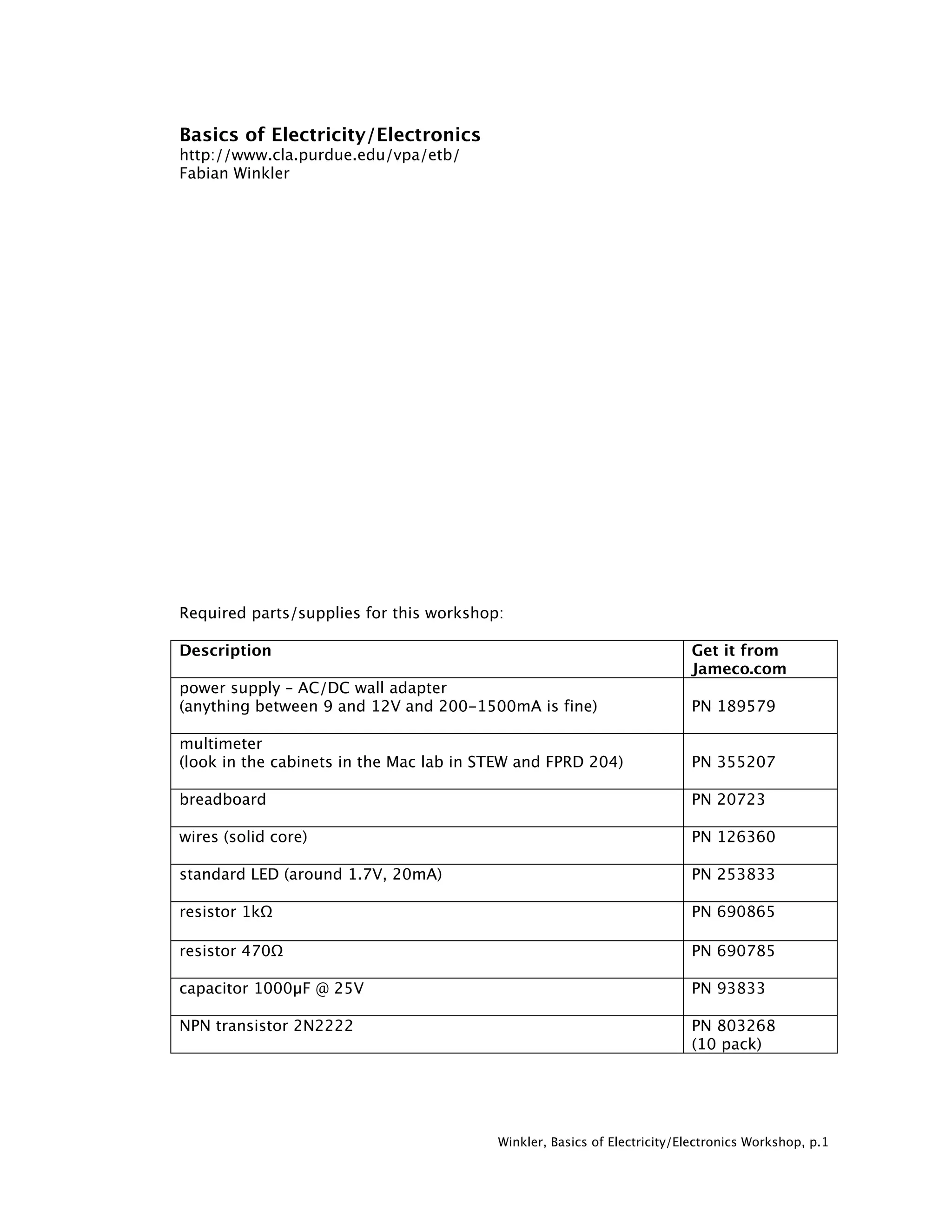 This document provides instructions and information for a basics of electricity/electronics workshop. It lists required parts and supplies that can be purchased from Jameco.com and describes key concepts like current, voltage, resistance, and Ohm's law. It also explains how to identify the positive and negative terminals of a power supply using a multimeter, and how breadboards work by connecting columns of holes vertically and rows horizontally to allow testing circuits. The document provides an overview of basic electronic components like wires, diodes, and transistors that will be used in examples and experiments in the workshop.