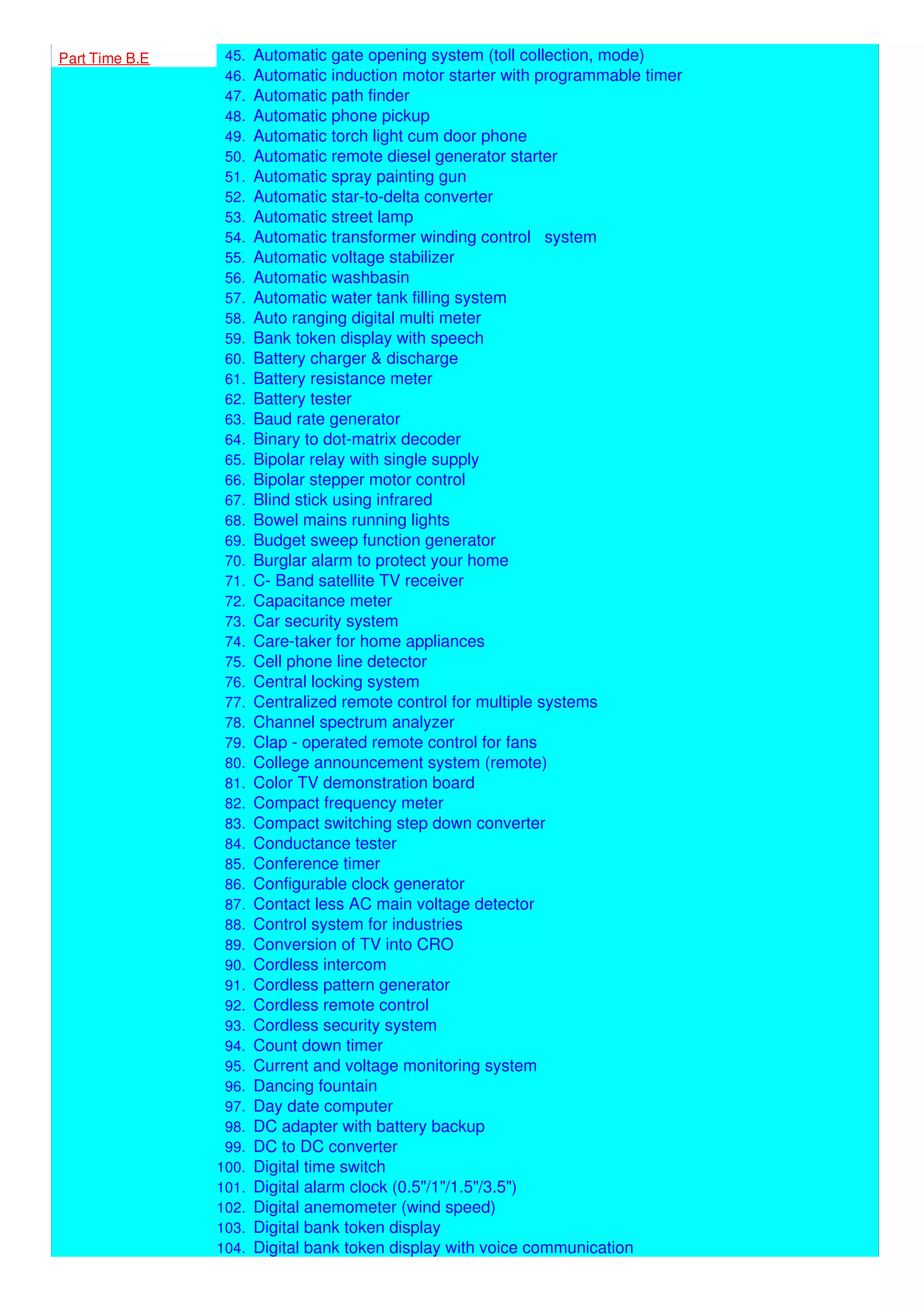 The document lists a comprehensive range of electronic projects and systems developed by Expert Systems and Solutions in Chennai, India, including various measurement tools, automation systems, control devices, and communication technologies. Each entry details projects such as digital meters, automated controllers for home appliances, and specialized testing equipment, showcasing innovations in electronics. This extensive collection highlights advancements in control and monitoring systems suitable for various applications in industries and everyday use.
