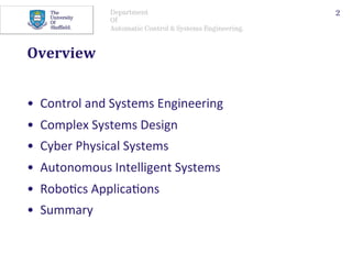 The document discusses how control engineering, systems engineering, and robotics can help enable a smarter planet through technologies like cyber-physical systems and autonomous intelligent systems. Control engineering plays a key role in applications through technologies like modeling, optimization, and decision-making. Systems engineering is important for integrating these technologies and designing complex systems. Robotics can deliver complete functionality through autonomous machines. Overall, these fields will be crucial for developing technologies to address challenges in areas like transportation, healthcare, and manufacturing.