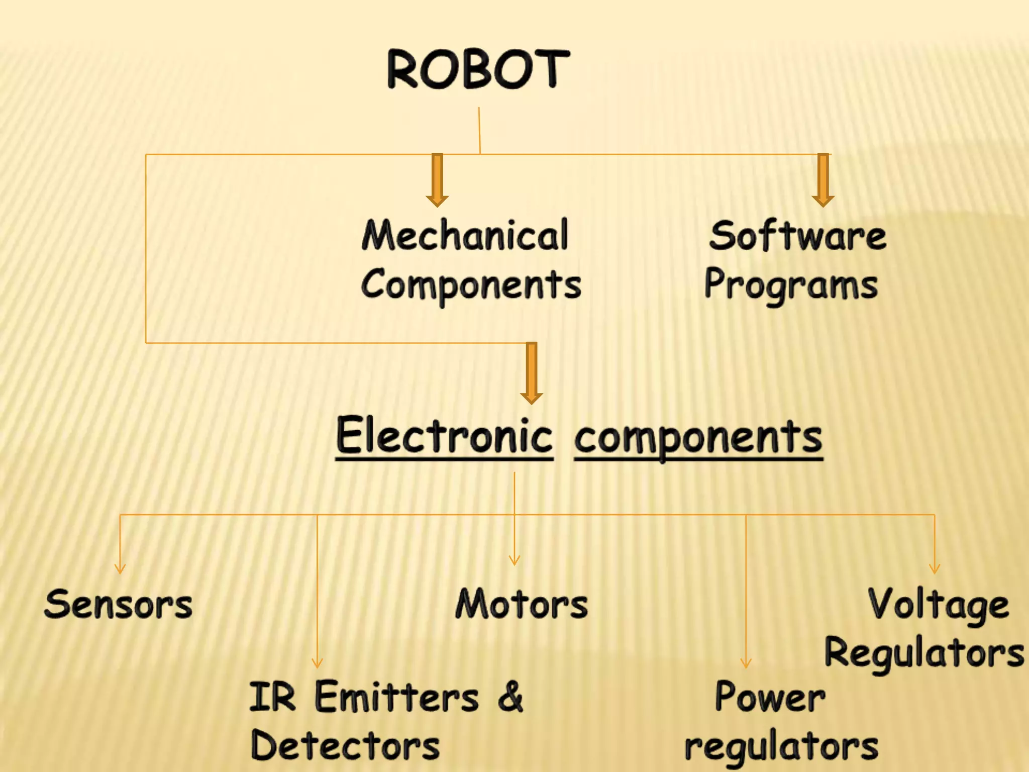 This document discusses various components used in robotics including electric motors, sensors, voltage regulators, and H-bridges. It describes how electric motors convert electrical energy to mechanical energy and lists common types like brushed DC motors, brushless DC motors, stepper motors, and servo motors. Sensors are outlined as playing a key role in robotics by allowing robots to maintain stability, report position/speed, interact with surroundings, distinguish objects, and mimic human senses. Voltage regulators are defined as devices that maintain a constant voltage level and various types are identified. H-bridges are described as circuits for controlling DC motor direction. Potential future applications of robotics discussed include expanded use in industrial, military, medical, and space