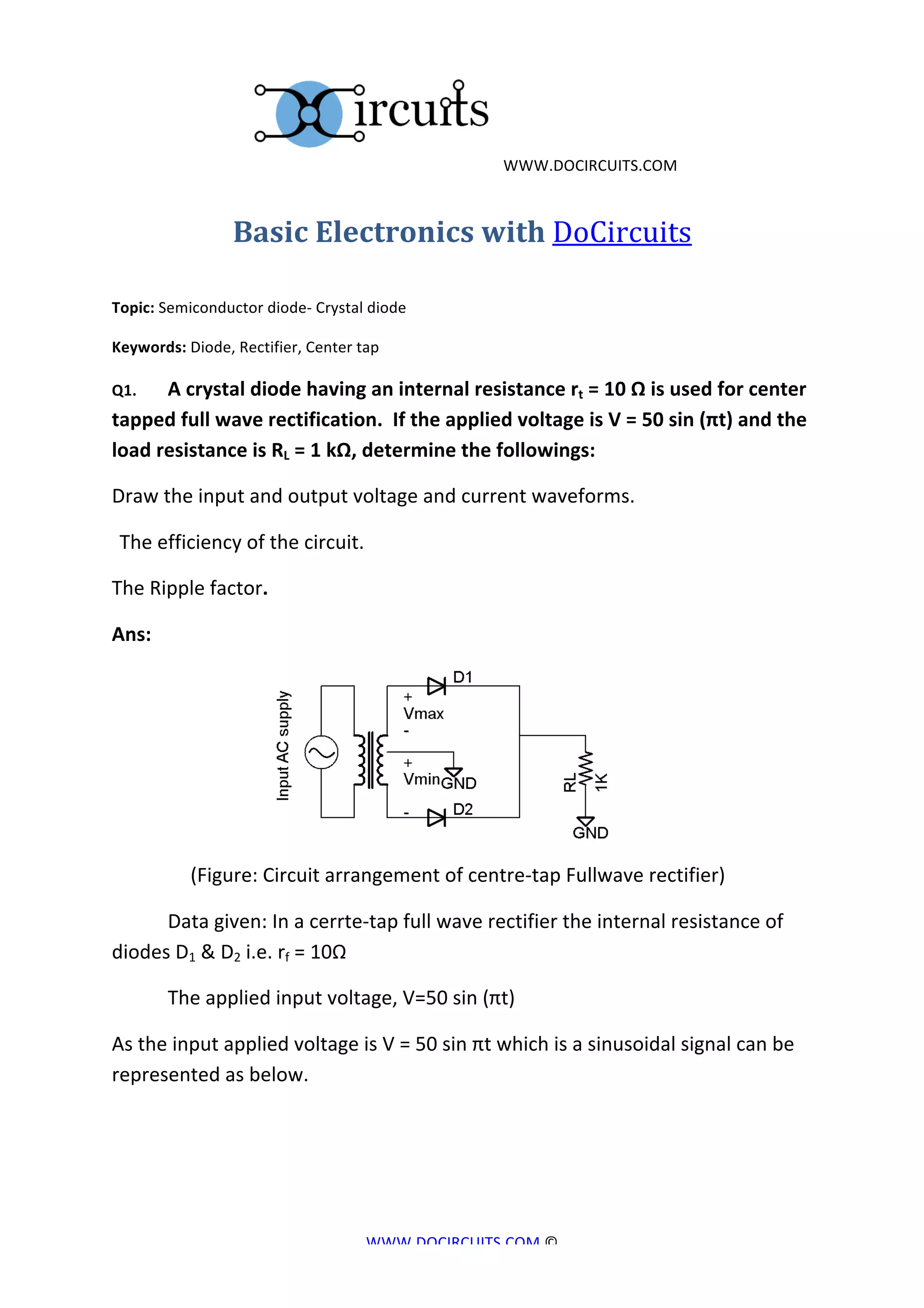 The document discusses various topics in basic electronics, specifically on semiconductor diodes, transistor biasing, operational amplifiers, and clipping circuits. It includes practical problems and their solutions involving wave rectification, transistor behavior, op-amp configurations, and building clipper circuits. Additionally, it provides circuit analysis and performance parameters such as efficiency and ripple factor.