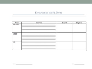 This document provides information about electronics and introduces some basic electronic components. It discusses that electronics involves using components to control and conduct electricity through circuits. Circuits have three parts: an input power source, electronic components that process the electricity, and an output. The document explains strip boards and breadboards that allow circuits to be built, and introduces Yenka circuit design software. It recaps some component identification and functions. Homework includes completing a worksheet, revising slides on circuit types, and redrawing a sample circuit in Yenka to analyze its type and voltage drops.
